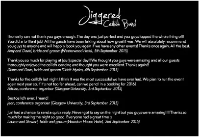 It’s always nice to hear back from clients who say that they’ve appreciated the service we have provided. This week we played Wednesday, Thursday, Friday and Saturday…and we’ve had lovely messages from each of the clients since then. Check out what these folk had to say about the Jiggered Ceilidh Band experience: